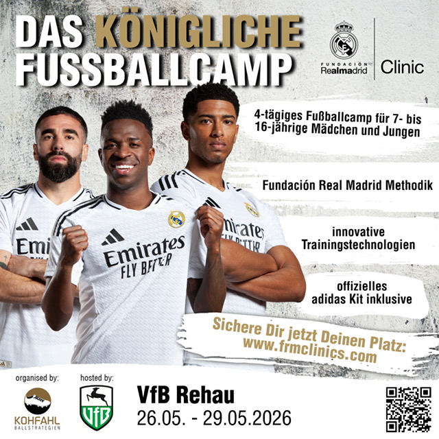 Das Fundación Real Madrid Fußballcamp, organisiert von Kohfahl Ballstrategien, kommt vom 26.05 bis 29.05.2026 zum VfB Rehau.