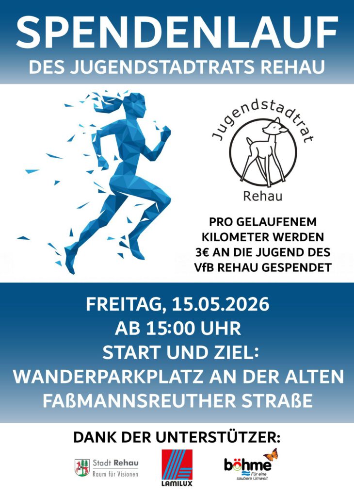 Am Freitag, den 15. Mai 2026, veranstaltet der Jugendstadtrat Rehau einen Spendenlauf, bei dem auch die Jugend des VfB Rehau profitiert. Für jeden gelaufenen Kilometer werden 3 Euro an die Nachwuchsarbeit des Vereins gespendet.